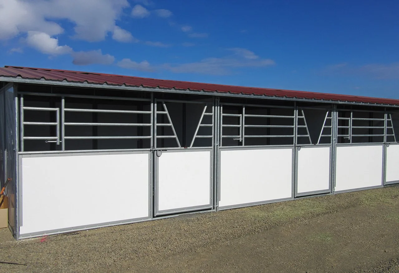 Noble Trainer Series Barns are pre-fabricated modular stall barns with an open center aisle. It is expandable and can be added onto at any time. The interior of the barn can be customized with tack rooms or open hay storage bays, as well as 12’ x 12’ or 12’ x 24’ stalls.